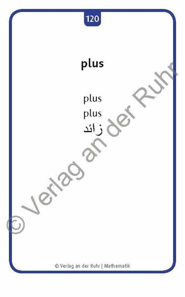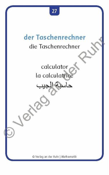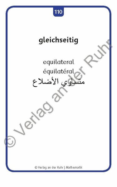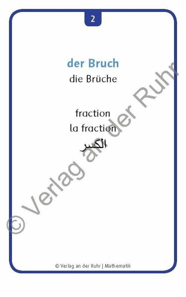 Bildkarten für DaZ-, Mathematiklehrer und Sprachförderkräfte an Schulen sowie für außerschulische Lehrkräfte, Fach: Sprachförderung, Deutsch als Zweitsprache/Fremdsprache, Mathematik. Für die Klassen 5-7; Sprachniveau A1-B1 +++ Herzlich willkommen! - Welcome! - Bienvenue! - Ahlaan wa sahlaan! Viele Schüler, die nach Deutschland kommen, wollen so schnell wie möglich Deutsch lernen, um aktiv am Unterricht teilnehmen zu können. Doch gerade das Fachvokabular der einzelnen Fächer stellt häufig eine Hürde dar und erschwert den Übergang von den Willkommensklassen in den Regelunterricht. Die 120 Bildkarten mit Fachbegriffen des Mathematikunterrichts sind flexibel einsetzbar und helfen Ihnen dabei, Ihren Schülern diesen Einstieg zu erleichtern. Auf der Vorderseite ist jeweils ein Bild von einem mathematischen Begriff, z. B. "der Bruch" oder "antiproportional", abgebildet, auf der Rückseite wird dieser in vier verschiedenen Sprachen (Deutsch, Englisch, Französisch, Arabisch) genannt. Die Substantive werden mit Artikel und im Singular sowie Plural angegeben. Zu besseren Unterscheidung sind die Genera farblich markiert. Die Verben des Sets werden konjugiert. Kurze Anwendungstipps runden die Bildkarten ab. So helfen Sie Ihren Schülern, sich schnell im Mathematikunterricht zurechtzufinden!