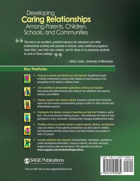 "This text provides a fresh look at an important topic-teachers and families working collaboratively. A strong blend of research and practical application is presented."-Beth Nason Quick, Tennessee State University "I was captivated by an innovative and a gentle, humanistic approach to viewing families and working with parents in parenting education."-Gloria Wenze, University of Scranton "A synthesis of theory, research, and practice couched in a very readable text... a provocative examination of teacher and parent relationships that holds the promise of a better future for the next generation of educators and parents. This book should fan the flames of professional reflection and professional practice." -William McInerney, University of Toledo Developing Caring Relationships Among Parents, Children, Schools, and Communities looks at parent-professional-child relations very differently than other books in this area. Author Dana McDermott focuses on parents and teachers as adult learners who should be growing and learning along with the children in their care. Accessibly written, the book synthesizes the latest theories and research on parent-and adult-child relations and on adult learning and development, focusing on a dynamic process rather than a static role and, on all the social-contextual factors affecting parents, teachers, and children. Key FeaturesFocuses on parents and teachers as adult learners: This will supplement traditional books on family involvement or parent child relations which rarely drill down to understand parents as anything more than a conduit to a child's development. Emphasizes the dynamic process of parenting and teaching: The author provides a useful tool, or a caring decision-making process, for parents, children, and professionals to think through any issues they face so that everyone's needs are considered in any interaction. Provides a theory to practice model to support parents, families, and teachers: This book lays out a theory of what parents and teachers need to care for children and themselves and then shows how to put these theories into practice in preK-12 schools. Uses narratives to demonstrate applications of theory and research: The latest theories and research are woven into stories from the voices of parents, teachers, and children. Explores research from diverse cultures: The book looks at many schools around the world and from various socioeconomic backgrounds to identify their common and differentiated concerns. Includes additional web resources: Questionnaires, workshops, newsletters, model development information, resource material and other exemplary projects/resource sites can be found in the appendices located at www.sagepub.com/mcdermottappendices Intended Audience This supplemental text is designed for undergraduate and graduate courses such as Parents/Home-School Relations in Early Childhood and Elementary Education; Parenting; and School and Community Relations in departments of education, psychology, family studies, health sciences, and social work.