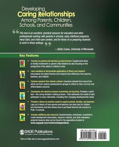 "This text provides a fresh look at an important topic-teachers and families working collaboratively. A strong blend of research and practical application is presented."-Beth Nason Quick, Tennessee State University "I was captivated by an innovative and a gentle, humanistic approach to viewing families and working with parents in parenting education."-Gloria Wenze, University of Scranton "A synthesis of theory, research, and practice couched in a very readable text... a provocative examination of teacher and parent relationships that holds the promise of a better future for the next generation of educators and parents. This book should fan the flames of professional reflection and professional practice." -William McInerney, University of Toledo Developing Caring Relationships Among Parents, Children, Schools, and Communities looks at parent-professional-child relations very differently than other books in this area. Author Dana McDermott focuses on parents and teachers as adult learners who should be growing and learning along with the children in their care. Accessibly written, the book synthesizes the latest theories and research on parent-and adult-child relations and on adult learning and development, focusing on a dynamic process rather than a static role and, on all the social-contextual factors affecting parents, teachers, and children. Key FeaturesFocuses on parents and teachers as adult learners: This will supplement traditional books on family involvement or parent child relations which rarely drill down to understand parents as anything more than a conduit to a child's development. Emphasizes the dynamic process of parenting and teaching: The author provides a useful tool, or a caring decision-making process, for parents, children, and professionals to think through any issues they face so that everyone's needs are considered in any interaction. Provides a theory to practice model to support parents, families, and teachers: This book lays out a theory of what parents and teachers need to care for children and themselves and then shows how to put these theories into practice in preK-12 schools. Uses narratives to demonstrate applications of theory and research: The latest theories and research are woven into stories from the voices of parents, teachers, and children. Explores research from diverse cultures: The book looks at many schools around the world and from various socioeconomic backgrounds to identify their common and differentiated concerns. Includes additional web resources: Questionnaires, workshops, newsletters, model development information, resource material and other exemplary projects/resource sites can be found in the appendices located at www.sagepub.com/mcdermottappendices Intended Audience This supplemental text is designed for undergraduate and graduate courses such as Parents/Home-School Relations in Early Childhood and Elementary Education; Parenting; and School and Community Relations in departments of education, psychology, family studies, health sciences, and social work.