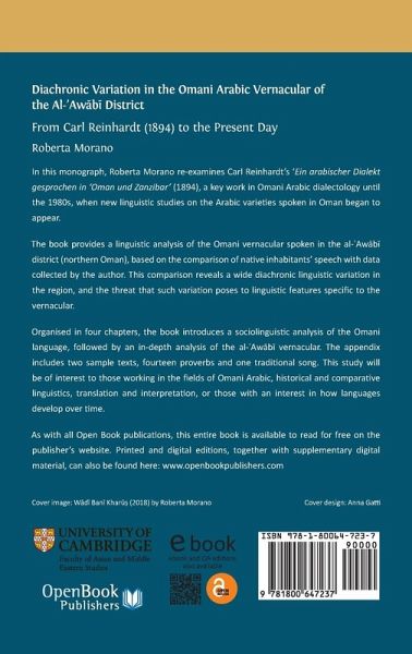 In this monograph, Roberta Morano re-examines one of the foundational works of the Omani Arabic dialectology field, Carl Reinhardt's Ein arabischer Dialekt gesprochen in 'Oman und Zanzibar (1894). This German-authored work was prolific in shaping our knowledge of Omani Arabic during the twentieth century, until the 1980s when more recent linguistic studies on the Arabic varieties spoken in Oman began to appear. Motivated by an urgent need to expand and reinforce our understanding of Omani Arabic, the book provides a linguistic analysis of the Omani vernacular spoken in the al-¿Aw¿b¿ district (northern Oman), based on the speech of fifteen informants recruited throughout the area. It also provides a comparative analysis of the new data with that collected by Carl Reinhardt in 1894. This comparison enables the reader to appreciate the extent of diachronic linguistic variation in the region, and also sheds light on the threats that such variation poses to Omani-specific linguistic features. Organised in four chapters, the book presents a sociolinguistic analysis of the Omani linguistic landscape followed by an examination of the phonology, morphology, and syntax of the al-¿Aw¿b¿ vernacular. Each chapter contains primary data collected by the author in situ compared, when applicable, with Carl Reinhardt's materials. The appendix includes two sample texts extrapolated from the recordings, fourteen proverbs and one traditional song. This study will be of interest to those working in the fields of Omani Arabic, historical and comparative linguistics, translation and interpretation, or those with an interest in how languages develop over time.