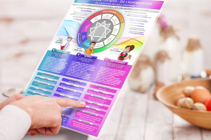Dieser übersichtliche Typfinder widmet sich der Triade derdrei Kopfmenschen mit ihren gemeinsamen Themen sowie ihren speziellen Charaktereigenschaften. Zu den Kopfmenschen gehören der Charakter "Forscher", der "Loyale" und der "Enthusiast".