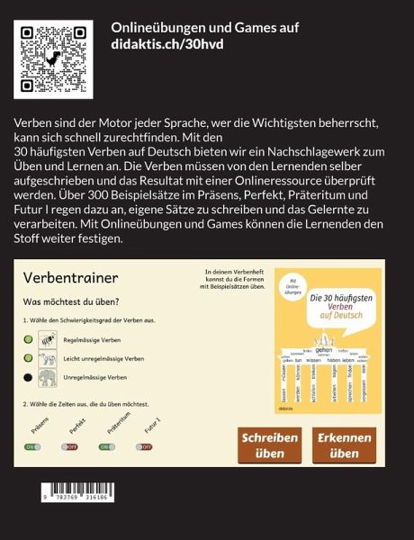 Verben sind der Motor jeder Sprache, wer die Wichtigsten beherrscht, kann sich schnell zurechtfinden. Mit den 30 häufigsten Verben auf Deutsch bieten wir ein Nachschlagewerk zum Üben und Lernen an. Die Verben müssen von den Lernenden selber aufgeschrieben und das Resultat mit einer Onlineressource überprüft werden. Über 300 Beispielsätze im Präsens, Perfekt, Präteritum und Futur I regen dazu an, eigene Sätze zu schreiben und das Gelernte zu verarbeiten. Mit Onlineübungen und Games können die Lernenden den Stoff weiter festigen.