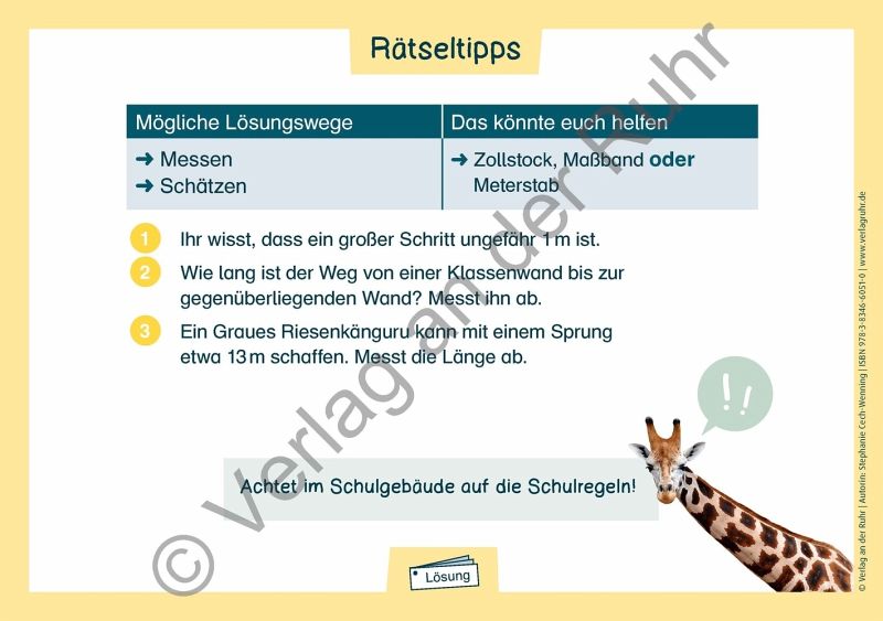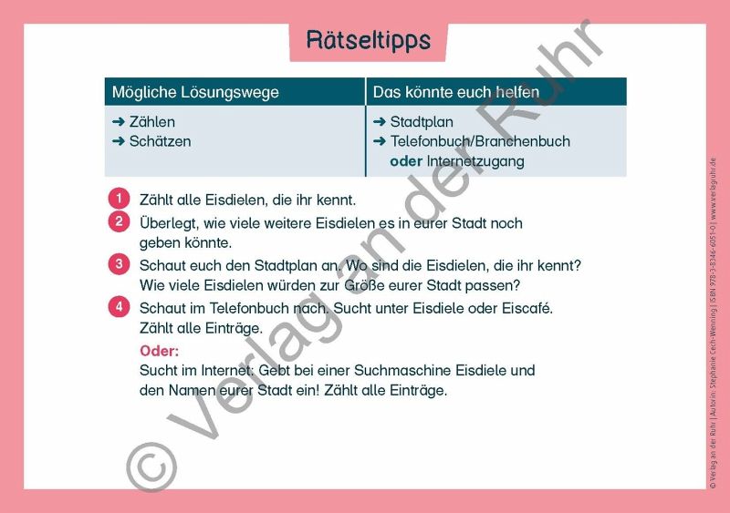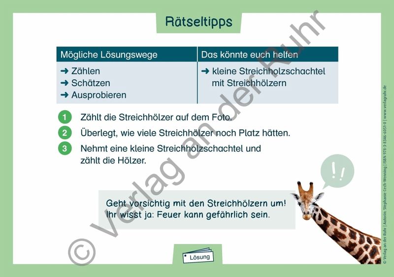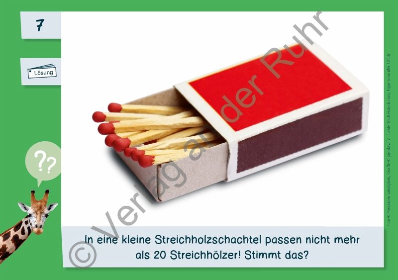 +++Übungskartei für Schüler und Schülerinnen an Grundschulen, Fach: Mathematik, Klasse 1-3 +++Wie viele Elefanten passen in unseren Klassenraum?Obwohl Sie niemals Dickhäuter in der Klasse beherbergen werden, sind es gerade diese nicht alltäglichen Überlegungen, die die Aufgaben dieser Fermi-Kartei für Kinder so reizvoll machen.Statt wild draufloszuraten, geht's hier ganz strukturiert auf Lösungssuche.Die 44 Rätselkarten sind immer gleich aufgebaut und 3-fach differenziert. Der Schwierigkeitsgrad kann sich im Zahlenraum, in der Aufgabenkomplexität oder im Anspruch der Lösungswege begründen.Auf der Karten-Vorderseite ist jeweils ein Bildimpuls mit einer offenen Fragestellung oder Behauptung, die es zu überprüfen gilt.Die Rückseite enthält Vorschläge für mögliche Lösungswege und Hinweise auf Hilfsmittel sowie aufeinander aufbauende Tipps.Zusätzlich unterstützen differenzierte Rätselprotokolle ein systematisches Notieren der Lösungsschritte.Mit den Tafelschildern "Unser Rätselweg" können Sie die einzelnen Etappen der Bearbeitung von Fermi-Aufgaben in sechs Schritten visualisieren. Dies hilft den Kindern, möglichst selbstständig zu arbeiten.Und für die kleinen Leseanfänger_innen hält das Material entsprechende Symbole bereit, damit Sie auch in dieser Altersstufe auf Rätsellösungsjagd gehen können.So entwickeln die Kinder ein Gefühl für Zahlen, Maßangaben und Mengen, lernen Repräsentanten für Größen kennen und schulen ihre Größenvorstellung im Zahlenraum bis 100 und darüber hinaus.Mit Lösungen und Rätsel-Pass.