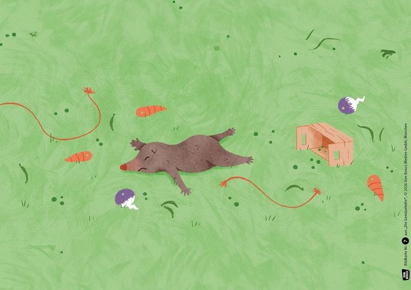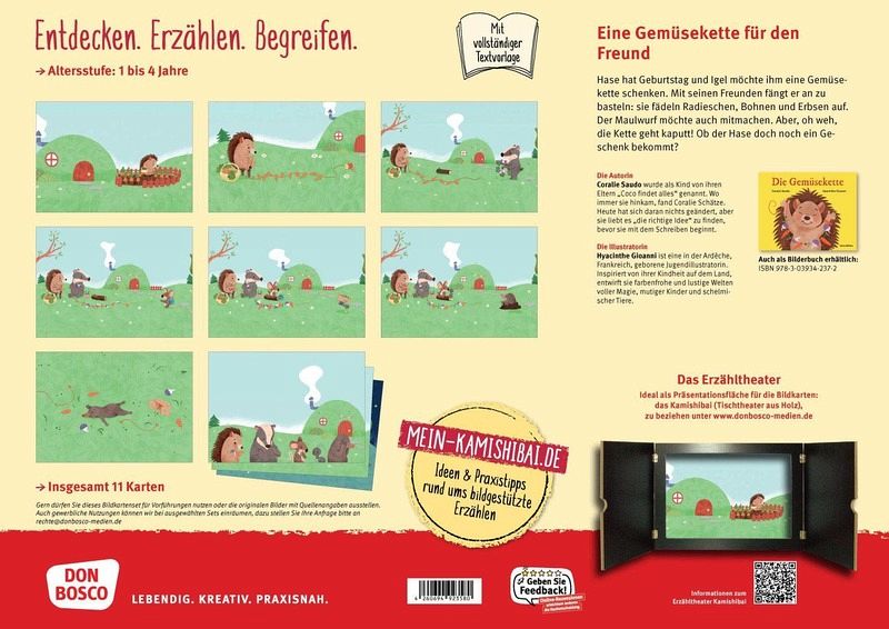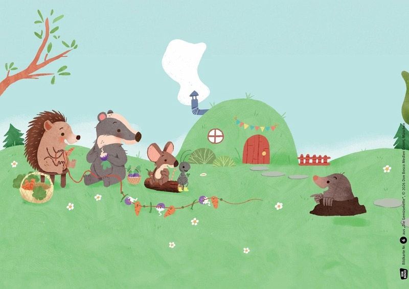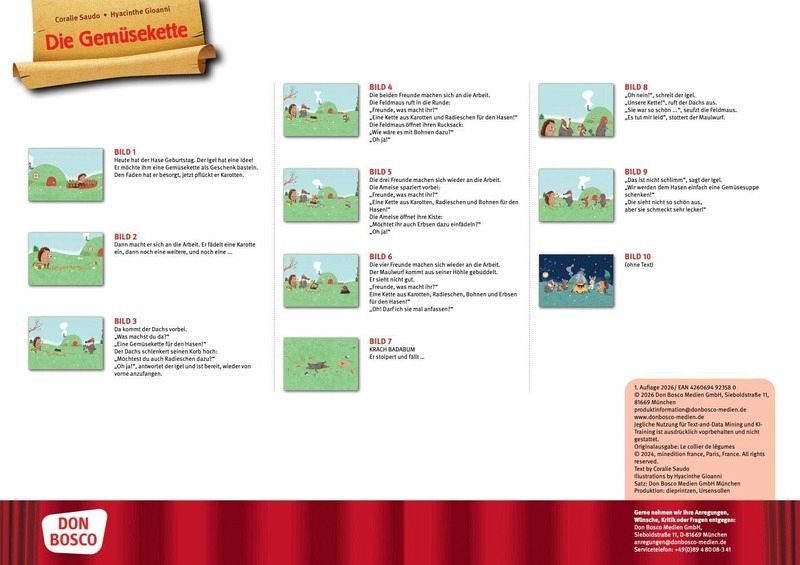 Für seinen Freund, den Hasen, plant der Igel ein ganz besonderes Geburtstagsgeschenk: eine kunterbunte Gemüsekette! Alle machen mit und fädeln geduldig Radieschen, Bohnen und Erbsen auf. Doch der unglückliche Maulwurf stolpert, weil er so schlecht sieht. Das schöne Geschenk ist kaputt! Da kommt ihnen die rettende Idee: Über eine leckere Gemüsesuppe freut sich der Hase bestimmt mindestens genauso!