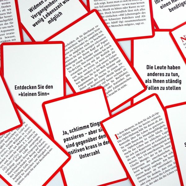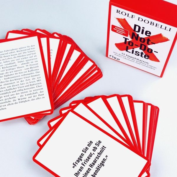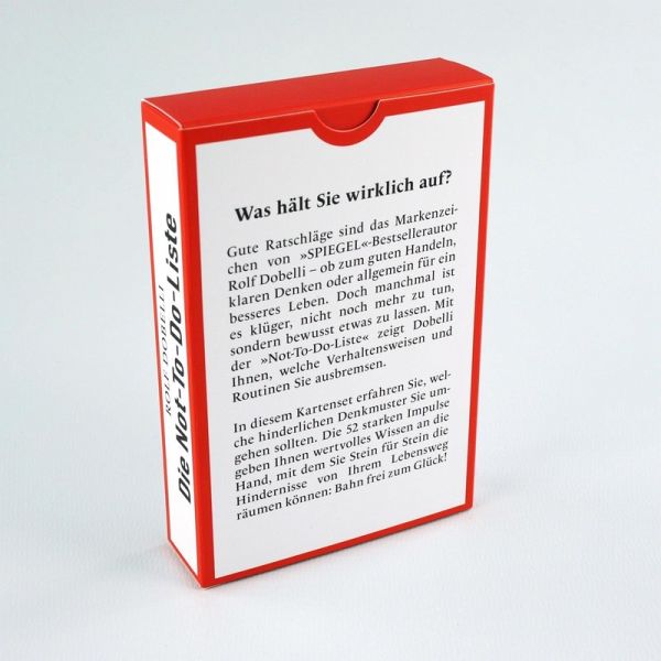 Gute Ratschläge sind das Markenzeichen von »SPIEGEL«-Bestsellerautor Rolf Dobelli - ob zum guten Handeln, klaren Denken oder allgemein für ein besseres Leben. Doch manchmal ist es klüger, nicht noch mehr zu tun, sondern bewusst etwas zu lassen. Mit der »Not-To-Do-Liste« zeigt Dobelli Ihnen, welche Verhaltensweisen und Routinen Sie ausbremsen. In diesem Kartenset erfahren Sie, welche hinderlichen Denkmuster Sie umgehen sollten. Die 52 starken Impulse geben Ihnen wertvolles Wissen an die Hand, mit dem Sie Stein für Stein die Hindernisse von Ihrem Lebensweg räumen können: Bahn frei zum Glück!