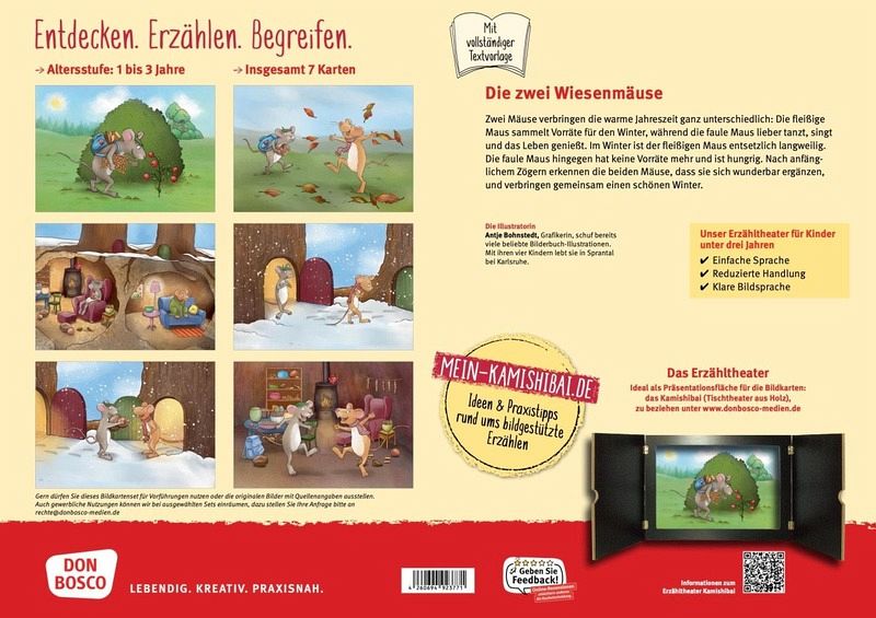 Eine kurze Mäusegeschichte erzählt auf 7 Kamishibai-BildkartenKlare Erzählbilder, einfache Sprache: ein Märchen für das Erzähltheater für Kinder von 1 bis 3 JahrenVermittelt altersgerecht Themen wie Zusammenhalt, Hilfsbereitschaft, Freundschaft, persönliche Stärken und ToleranzKomplett-Set mit Bildkarten, Textvorlage und MitmachideenFür eine gelungene Märchenstunde in der Krippe oder bei der Tagesmutter