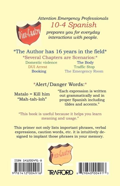 Diez-Cuatro: 10-4 Spanish for Law Enforcement prepares emergency professionals for everyday interactions on the job, including several chapters for scenarios with domestic violence, a DUI arrest, booking, the body, a traffic stop and the emergency room. This primer not only lists important phrases, verbal expressions, caution words, etc. it is also intuitively designed to implant those phrases into your memory.