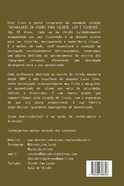 DINOSSAUROS EM CHINÊS PARA COLORIR, LER E ESCREVER é parte integrante da renomada coleção VOCABULÁRIO EM CHINÊS PARA COLORIR, LER E ESCREVER . Cada