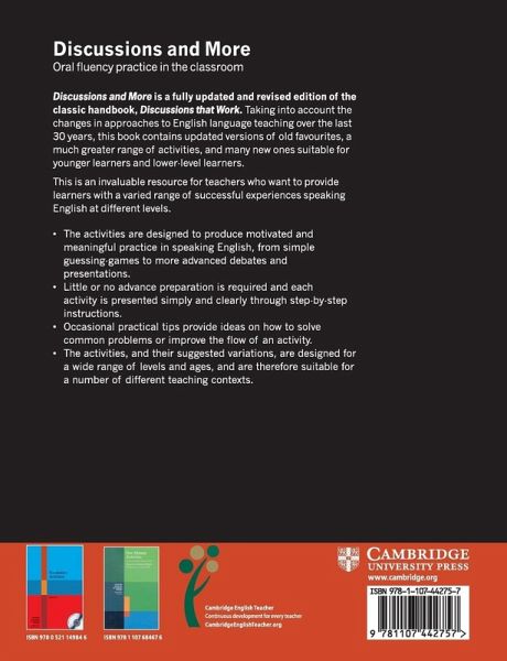 Discussions and More is an updated version of the classic handbook Discussions that Work and an invaluable resource for teachers who want to provide learners with a varied range of successful speaking activities. This second edition takes into account the changes in approaches to ELT over the last thirty years which means that, as well as containing updated versions of old favourites, the book has a much greater range of oral fluency activities from game-like activities to debates and presentations. It includes many new activities suitable for younger learners and lower level learners, making is suitable for a wide range of teaching contexts where teachers are keen to develop learners' speaking skills. Activities are meaningful and motivating, require minimal preparation and result in high interaction.