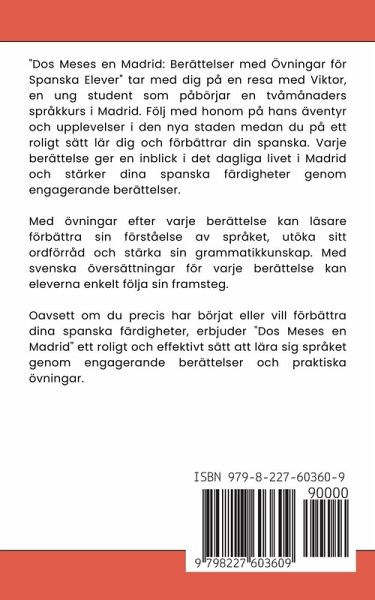 "Dos Meses en Madrid: Berättelser med Övningar för Spanska Inlärare" följer en ung mans resa när han påbörjar en två månader lång språkkurs i Madrid. Genom hans upplevelser och äventyr i staden får läsarna inte bara följa hans historia utan också lära sig och öva spanska längs vägen. Följ med denna karaktär när han navigerar de livliga gatorna i Madrid, skaffar nya vänner och fördjupar sig i den lokala kulturen. Varje berättelse är utformad för att ge insikter i vardagslivet i Madrid samtidigt som den förstärker spanska språkkunskaper genom engagerande berättelser. Genom en kombination av fängslande berättande och övningar kan läsarna förbättra sin språkförståelse, ordförråd och grammatik. Dessutom medföljer svenska översättningar till varje berättelse, vilket säkerställer att inlärare kan kontrollera sin förståelse och göra framsteg med självförtroende. Oavsett om du är nybörjare eller vill förbättra dina spanskakunskaper erbjuder "Dos Meses en Madrid" ett njutbart och effektivt sätt att lära sig språket genom fängslande berättelser och praktiska övningar.