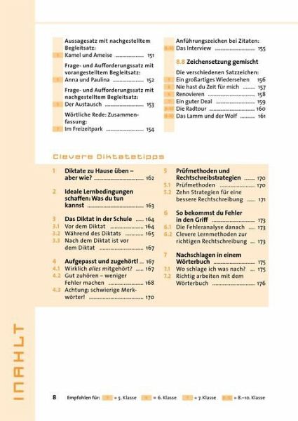 Die Schreibung erfolgt nach der Dudenempfehlung mit Angabe aller Varianten bei mehreren zulässigen Schreibweisen. Übersichtliche Merkkästen mit allen Rechtschreibregeln stehen direkt beim Diktat. Ein Extrakapitel vermittelt clevere Tipps und Techniken zur Selbstkontrolle. Außerdem wird eine umfangreiche Lernkartei zum Download angeboten.