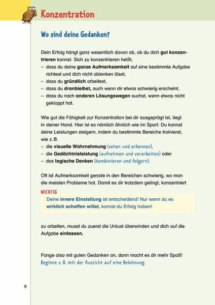Der Übergang von der Grundschule aufs Gymnasium ist oft die erste größere Hürde in der Schullaufbahn - insbesondere seitdem die Anforderungen durch die Verkürzung der Gymnasialzeit noch gestiegen sind. Konzentration spielt bei der Bewältigung des Lernstoffes eine wichtige Rolle. Mit diesem Band "Startklar fürs G8 - Konzentration und Lerntipps" können die Schüler ihre Konzentrationsfähigkeit testen und steigern. Abwechslungsreiche Aufgaben trainieren Gedächtnis, Wahrnehmung sowie logisches Denken. Die praktischen Lerntipps helfen, Lernschwierigkeiten erfolgreich zu meistern. Eltern finden in einem separaten Ratgeberheft Antworten auf ihre Fragen rund um das Thema G8.