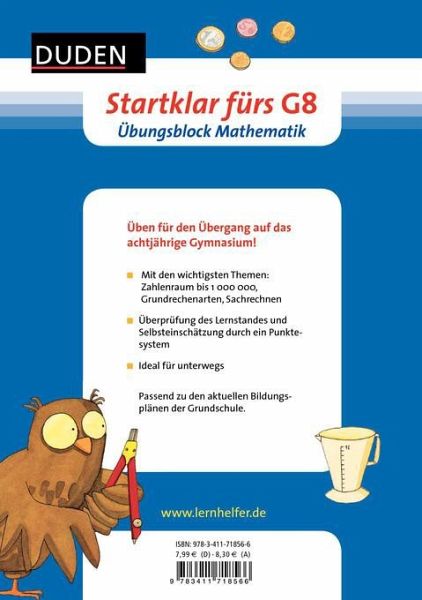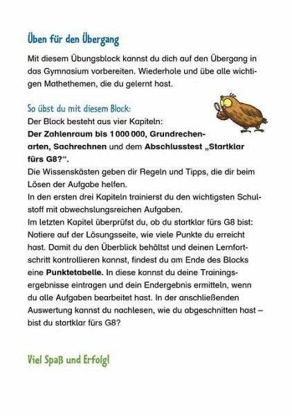 Mit diesem Übungsblock aus der Reihe Startklar fürs G8 macht das Üben für den Schulübergang in die 5. Klasse Spaß. In kleinen Übungseinheiten können die Themen Zahlenraum bis 1 000 000, Grundrechenarten und Sachrechnen noch einmal wiederholt und trainiert werden. Im Abschlusskapitel Startklar fürs G8? kann getestet werden, ob man fit für den Schulübergang ist - das Punktesystem macht es möglich. Ideal für die kurze Trainingseinheit , z. B. in den Sommerferien. Durch das kleine A5-Format ist der Übungsblock optimal für unterwegs.