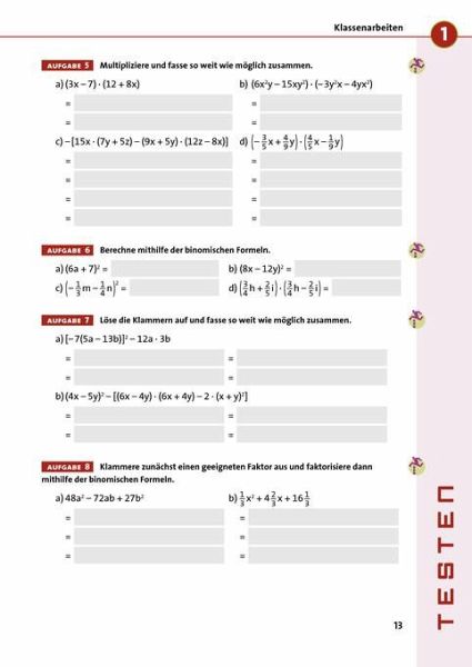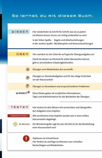 Die Reihe "Wissen - Üben - Testen" bietet 3-faches Training für bessere Noten: Im Wissensteil jedes Kapitels werden alle Regeln anhand passender Beispiele erläutert. Der Übungsteil enthält zahlreiche Übungsaufgaben in drei Schwierigkeitsstufen für ein individuelles Training. Am Ende der Kapitel folgt ein Testteil mit je ein bis drei Klassenarbeiten zur Erfolgskontrolle. Mit herausnehmbarem Lösungsheft, persönlichem Klassenarbeitsplaner und Topthemen im Schnellcheck.