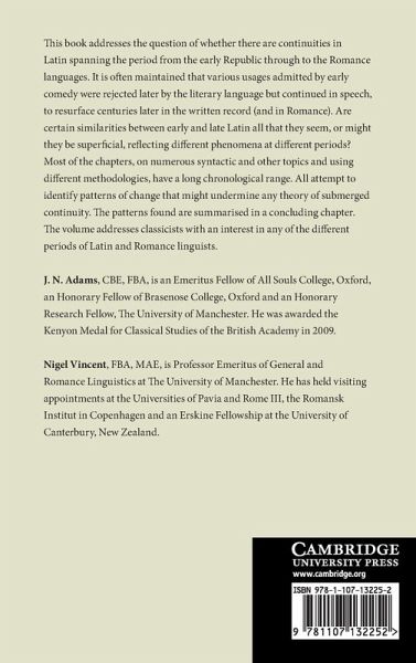 This book addresses the question of whether there are continuities in Latin spanning the period from the early Republic through to the Romance languages. It is often maintained that various usages admitted by early comedy were rejected later by the literary language but continued in speech, to resurface centuries later in the written record (and in Romance). Are certain similarities between early and late Latin all that they seem, or might they be superficial, reflecting different phenomena at different periods? Most of the chapters, on numerous syntactic and other topics and using different methodologies, have a long chronological range. All attempt to identify patterns of change that might undermine any theory of submerged continuity. The patterns found are summarised in a concluding chapter. The volume addresses classicists with an interest in any of the different periods of Latin, and Romance linguists.