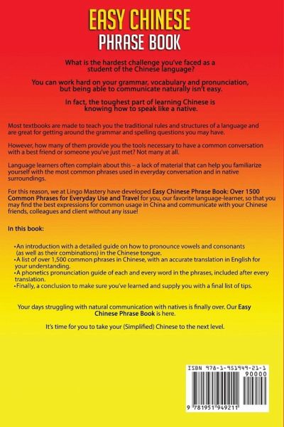 What is the hardest challenge you've faced as a student of the Chinese language? You can work hard on your grammar, vocabulary and pronunciation, but being able to communicate naturally isn't easy. In fact, the toughest part of learning Chinese is knowing how to speak like a native. Most textbooks are made to teach you the traditional rules and structures of a language and are great for getting around the grammar and spelling questions you may have. However, how many of them provide you the tools necessary to have a common conversation with a best friend or someone you've just met? Not many at all. Language learners often complain about this - a lack of material that can help you familiarize yourself with the most common phrases used in everyday conversation and in native surroundings. For this reason, we at Lingo Mastery have developed Easy Chinese Phrase Book: Over 1500 Common Phrases for Everyday Use and Travel for you, our favorite language-learner, so that you may find the best expressions for common usage in China and communicate with your Chinese friends, colleagues and client without any issue! In this book: · An introduction with a detailed guide on how to pronounce vowels and consonants (as well as their combinations) in the Chinese tongue.· A list of over 1,500 common phrases in Chinese, with an accurate translation in English for your understanding.· A phonetics pronunciation guide of each and every word in the phrases, included after every translation.· Finally, a conclusion to make sure you've learned and supply you with a final list of tips. Your days struggling with natural communication with natives is finally over. Our Easy Chinese Phrase Book is here. It's time for you to take your (Simplified) Chinese to the next level.