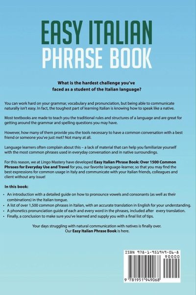 What is the hardest challenge you've faced as a student of the Italian language? You can work hard on your grammar, vocabulary and pronunciation, but being able to communicate naturally isn't easy. In fact, the toughest part of learning Italian is knowing how to speak like a native. Most textbooks are made to teach you the traditional rules and structures of a language and are great for getting around the grammar and spelling questions you may have. However, how many of them provide you the tools necessary to have a common conversation with a best friend or someone you've just met? Not many at all. Language learners often complain about this - a lack of material that can help you familiarize yourself with the most common phrases used in everyday conversation and in native surroundings. For this reason, we at Lingo Mastery have developed Easy Italian Phrase Book: Over 1500 Common Phrases for Everyday Use and Travel for you, our favorite language-learner, so that you may find the best expressions for common usage in Italy and communicate with your Italian friends, colleagues and client without any issue! In this book: An introduction with a detailed guide on how to pronounce vowels and consonants (as well as their combinations) in the Italian tongue. A list of over 1,500 common phrases in Italian, with an accurate translation in English for your understanding. A phonetics pronunciation guide of each and every word in the phrases, included after every translation. Finally, a conclusion to make sure you've learned and supply you with a final list of tips. Your days struggling with natural communication with natives is finally over. Our Easy Italian Phrase Book is here. It's time for you to take your Italian to the next level.