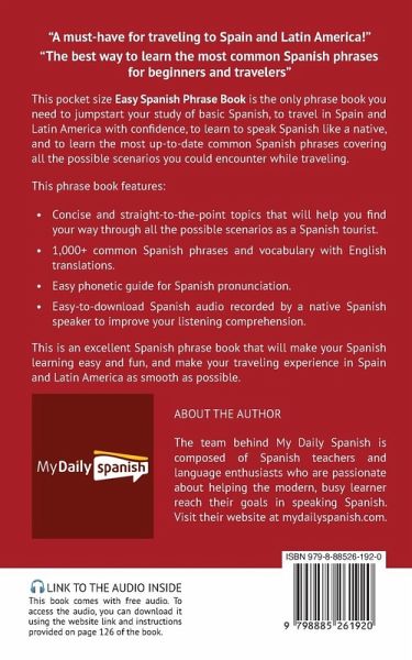 An Easy Spanish Phrase Book and dictionary with the most updated common Spanish phrases + downloadable audio! (2022 Edition) Are you looking to jumpstart your study of basic Spanish language? Do you want to learn the most common phrases used in everyday Spanish conversation? Are you traveling to Spain, Latin America, or any Spanish-speaking destination? Do you want to learn how to speak Spanish like a native? This easy-to-carry pocket size Spanish travel book is all you need to handle a wide range of scenarios on your Spanish holiday. From the moment you step out of the airport to when you say "adiós," this thoughtful little Spanish guide will tell you the right words to say at the moments you need them most. Inside Easy Spanish Phrase Book, you will find: Concise and straight-to-the-point topics - A Spanish book that cuts to the chase, with no unnecessary topics included. Now you can avoid wading through all the fluff and get straight to the essentials.All of these phrases will help you find your way through all the possible scenarios as a Spanish tourist. 1,000+ Spanish phrases and expressions with English translations - These are the most updated common Spanish phrases for everyday and travel use. All phrases include an easy phonetic pronunciation guide. Formatted for easy navigation and reading - The simple structure of the book and clear table of contents make it easy for you to browse and locate topics quickly. Easy to download Spanish audio - The high-quality audio provided is narrated by a native Spanish speaker to help train your ear to the authentic sound of words and to learn to speak Spanish naturally. And so much more! This is an excellent Spanish phrase book that will make your Spanish learning easy and fun, and make your traveling experience in Spain and Latin America as smooth as possible. Grab your copy now and become bilingual in Spanish!