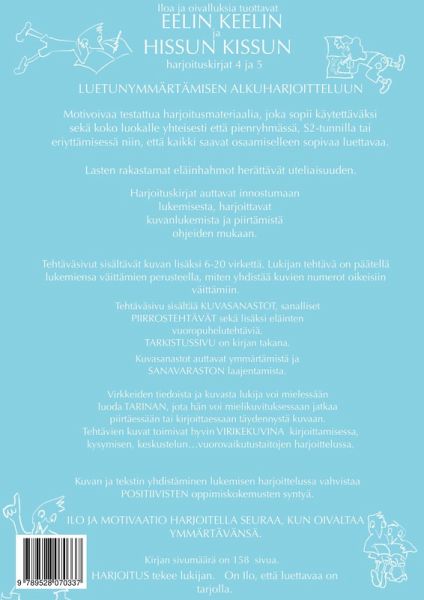 Eelin Keelin Klot ja Hissun Kissun luetunymmärtämistehtäväkirjat 4 ja 5 sisältävät motivoivaa harjoitusmateriaalia käytettäväksi koko luokan yhteisillä tunneilla, pienryhmässä sekä eriyttämisessä että S2-opetuksessa niin, että kaikki saavat osaamiselleen sopivaa luettavaa. Lasten rakastamat hahmot herättävät uteliaisuuden. Harjoitustehtävät auttavat innostumaan lukemisesta, harjoittavat kuvanlukemista ja piirtämistä ohjeen mukaan. Tehtävät sisältävät kuvan lisäksi 6-20 virkettä. Lukijan tehtävä on päätellä lukemiensa väittämien perusteella, miten yhdistää kuvien numerot oikeisiin väittämiin. Tehtäväsivu sisältää kuvasanastot, sanalliset piirrostehtävät sekä lisäksi eläinten vuoropuhelutehtäviä. Tarkistussivu on kirjan takana. Kuvasanastot auttavat ymmärtämistä ja sanavaraston laajentamista. Tehtävien kuvat toimivat hyvin myös virikekuvina kirjoittamiseen, kysymisen harjoitteluun, keskusteluun....vuorovaikutustaitojen harjoitteluun. Kuvan ja tekstin yhdistäminen lukemisen harjoittelussa vahvistaa positiivisten oppimiskokemusten syntyä. Ilo ja motivaatio harjoitella seuraa, kun oivaltaa ymmärtävänsä. Kirjojen sivumäärä on 158 sivua.
