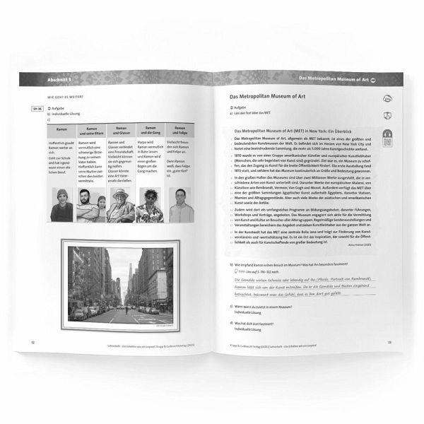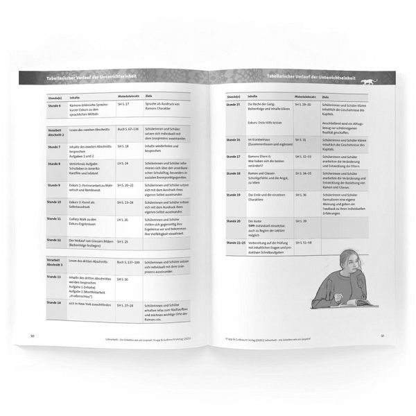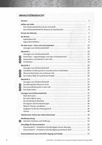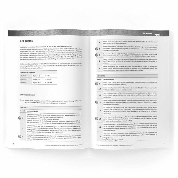Pflichtlektüre in Baden-Württemberg für den Hauptschulabschluss 2026. Unser Lehrerheft zum Schülerarbeitsheft zu Ein Schatten wie ein Leopard von Myron Levoy enthält nicht nur die Lösungen der Aufgaben, sondern unterstützt bei der Planung eines abwechslungsreichen Deutschunterrichts, der Spaß an der Lektüre weckt und die Lesemotivation anregt. Das Unterrichtsmaterial enthält zusätzliche Arbeitsblätter und Unterrichtsideen zur weiteren Vertiefung der Themen. Das Lehrerheft enthält 1. Einsatz des Schülerarbeitsheftes im Unterricht: didaktisch-methodische Hinweise 2. Lösungen zu den Aufgaben des Schülerarbeitsheftes 3. Zusätzliche Arbeitsblätter zu gesellschaftlichen und literarischen Themen z. B. * Puerto Rico - eigenständiges Land oder US-Bundesstaat? * Auswandern und Arbeiten in den USA * Prostitution in den 1980ern * Das Metropolitan Museum of Art * Das Gesundheitssystem in den USA 4. Glossar, Kapitelübersicht, Figurenkonstellationen und tabellarischer Verlaufsplan zum Taschenbuch 5. Schreibplan zu den Schreibaufgaben im Schülerarbeitsheft 6. Klassenarbeitsvorschlag   Der Downloadbereich für Lehrkräfte enthält * Arbeitsblätter in Farbe als Kopiervorlage * Karte von New York * Weitere Hinweise und die Lösungen zum Schülerarbeitsheft für Deutsch als Zweitsprache * Informationen und Hinweise zum Hörbuch * Zeilenmesser * Illustrationen ------------------------------------ Wir empfehlen ergänzend * Trainingsbuch - Sicher zum Hauptschulabschluss Deutsch Baden-Württemberg 2026 - ISBN: 978-3-96323-118-6 * Ein Schatten wie ein Leopard - Schülerarbeitsheft - ISBN: 978-3-96323-138-4 * Ein Schatten wie ein Leopard - Schülerarbeitsheft für Deutsch als Zweitsprache (DaZ) - 978-3-96323-141-4