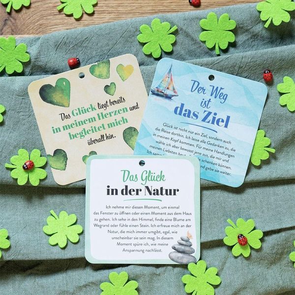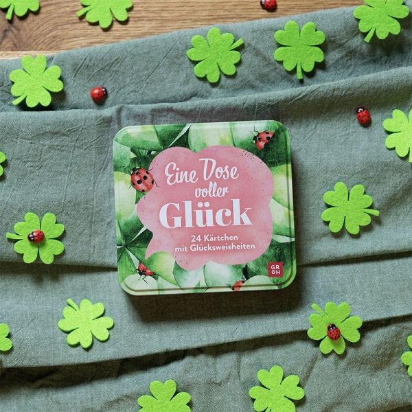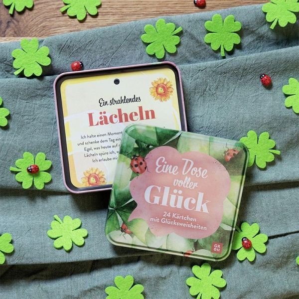 Hochwertige Metalldose mit 24 Kärtchen (Maße: 9,9x9,4 cm)Kartenset mit 24 Impulsen und Gedanken für mehr Glücksmomente im AlltagDas perfekte kleine Mitbringsel für liebe Menschen