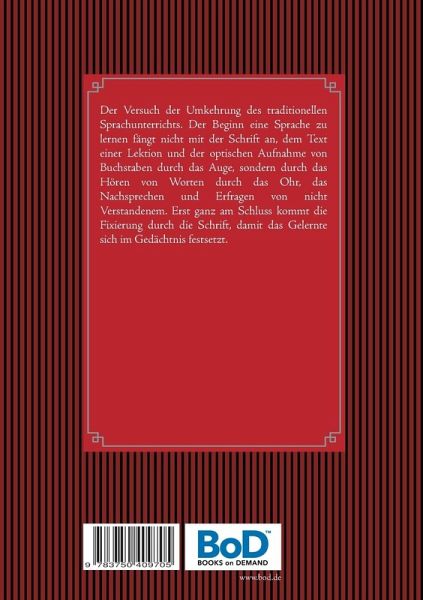 Der Versuch der Umkehrung des traditionellen Sprachunterrichts. Der Beginn eine Sprache zu lernen fängt nicht mit der Schrift an, dem Text einer Lektion und der optischen Aufnahme von Buchstaben durch das Auge, sondern durch das Hören von Worten durch das Ohr, das Nachsprechen und Erfragen von nicht Verstandenem. Erst ganz am Schluss kommt die Fixierung durch die Schrift, damit das Gelernte sich im Gedächtnis festsetzt.