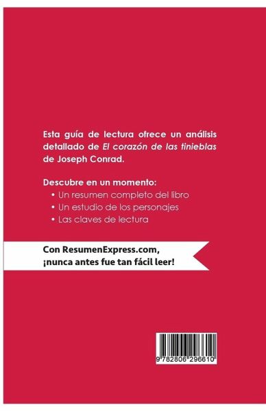 ResumenExpress.com presenta y analiza en esta guía de lectura de El corazón de las tinieblas de Joseph Conrad, una novela en la que se explora el tema del colonialismo a través de la historia de un viejo marinero que recuerda los viajes que realizó a África. Este relato legendario sobre la oscuridad del alma humana, la barbarie de la civilización y la brutalidad de nuestra mente no dejará indiferente al lector. ¡Ya no tienes que leer y resumir todo el libro, nosotros lo hemos hecho por ti! Esta guía incluye: ¿ Un resumen completo del libro ¿ Un estudio de los personajes ¿ Las claves de lectura ¿ Pistas para la reflexión ¿Por qué elegir ResumenExpress.com? Para aprender de forma rápida. Porque nuestras publicaciones están escritas con un estilo claro y conciso que te ayudará a ganar tiempo y a entender las obras sin esfuerzo. Disponibles en formato impreso y digital, te acompañarán en tu aventura literaria. Toma una dosis de literatura acelerada con ResumenExpress.com