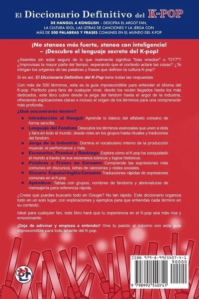 ¡Descubre el lenguaje secreto del K-pop! ¿Asientes sin estar seguro de lo que realmente significa "bias wrecker" o "OT7"? ¿Improvisas la mayor parte del tiempo, esperando que el contexto aclare las cosas? ¿Te intrigan los orígenes de las palabras y frases que definen la cultura K-pop? Si es así, El Diccionario Definitivo del K-Pop tiene todas las respuestas. Con más de 500 términos, esta es la guía imprescindible para entender el idioma del K-pop. Perfecto para fans de cualquier nivel, desde los recién llegados hasta los más dedicados, este libro cubre desde la jerga del fandom hasta el argot de la industria, ofreciendo explicaciones claras e incluso el origen de los términos para una comprensión más profunda.¿Qué encontrarás dentro?Introducción al Hangul - Aprende lo básico del alfabeto coreano de forma sencilla. Lenguaje del Fandom - Descubre los términos esenciales que unen a idols y fans en todo el mundo, desde roles en los grupos hasta rituales y tradiciones del fandom. Jerga de la Industria - Domina el vocabulario interno de la producción musical, el performance y más. Escenarios, Premios y Rankings - Explora cómo el K-pop ha conquistado el mundo a través de sus escenarios icónicos y logros históricos. Palabras y Frases en Coreano - Comprende las expresiones más comunes en discursos, letras de canciones y redes sociales. Glosario Inglés-Coreano - Traducciones rápidas de expresiones comunes en el K-pop. Apéndice - Tablas con grupos, nombres de fandoms y abreviaturas de mensajería para referencia rápida. Este diccionario organiza todo en un solo lugar, con explicaciones y ejemplos para que entiendas cada término en su contexto.