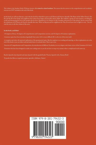 Important Note: This volume is the Student's Book: Without Answers. It is aimed to school students. This means that the answers to the comprehension and vocabulary exercises are NOT included at the end of the book. If you are a teacher or a self-taught student, make sure you buy the regular version of the book (with the answers to the exercises included), which is also available on this web. Would you like to find a good book to read in Spanish? Are you tired of short stories that make no sense at all? Are you looking for a good story to read and not only for a book written in easy Spanish? Probably you will like El Planeta del Desierto Amarillo then. This Spanish book is the first volume of a series called El Universo de los Hanún-Ais. This series is composed of three original fantasy books graded in three levels: A2-B1(Introductory), B1-B2 (Intermediate) and B2-C1 (Advanced). Even though the three novels are placed in the same universe and are connected among them, every book is auto-conclusive, so you do not need to read the other two to understand the story. These books have been written by J.M.Hernández, a native and experienced Spanish teacher who has a degree in Spanish linguistics and more than 10 years of teaching experience. His approach is creating language books with good and clear writing, careful explanation of the grammar and vocabulary, but, above all, with relevant and enjoyable content. He is passionate about fantasy stories and writers like J.R.R. Tolkien and Michael Ende among many others. He also loves helping students to grasp the details of his language. His main objective is to have a really enjoyable story and not merely something boring written in Spanish. His objective is to help you. You can learn Spanish and at the same time enjoy reading. In this book you will meet Bayuná, a man who has lived his whole life in peace on El Planeta del Desierto Amarillo (The Planet of the Yellow Desert). His life and the life of his family and neighbours have always been happy and peaceful, almost idyllic. But suddenly a group of cruel enemies is invading his world and threatening the lives of the people who he loves. Manajaín-Ja is an Hanún-Ai (the Guardian and protector of the planet), but he cannot help the inhabitants of El Planeta del Desierto amarillo this time. What can Bayuná and his neighbours do? They do not know how to fight in a war… You can read the story in the first volume of the series. In this book, you'll find: -10 chapters of Story, 10 chapters of Comprehension and Composition exercises, and 10 chapters of Grammar explanations. -Grammar topics have been introduced gradually from easier (A2) to more difficult (B1) in the text of the story itself. -A complete and, above all, practical explanation of the grammatical topics. But the emphasis is on reading and enjoying, so, these explanations are at the end of the book so you can either read and study them or overlook them. That is up to you. -Exercises of Comprehension and Composition, the introduction of different Vocabulary in every chapter, and a basic review of the Grammar of A1 level. -Footnotes that have been designed to make your reading easier so you do not have to stop every minute when a complicated word comes up. Read in Spanish, learn Spanish and enjoy Spanish with the graded books "Practice Spanish with a Fantasy Book". Tú puedes leer libros en español, practicar, aprender y disfrutar. ¡Vamos!