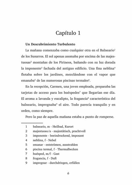 Leseprobe: https://easyoriginal.com/leseproben/DS22W.pdf Tauchen Sie ein in die geheimnisvollen Tiefen des Balneario de los Susurros!In diesem luxuriösen Spa in den spanischen Pyrenäen verspricht das Wasser ewige Jugend. Doch unter der glitzernden Oberfläche brodeln dunkle Geheimnisse.Als der Geschäftsmann Alejandro Mendoza tot im Whirlpool gefunden wird, beginnt eine Ermittlung, die Jahrzehnte alte Verschwörungen ans Licht bringt. Die Chefärztin Elena Martí muss sich ihrer eigenen Vergangenheit stellen. Der undercover ermittelnde Journalist Xavier Prat kommt einer explosiven Story auf die Spur. Und die geheimnisvolle Dauerbesucherin Doña Pilar hütet Geheimnisse, die Menschenleben kosten könnten.In diesem packenden Thriller voller unerwarteter Wendungen vermischen sich Gier, Leidenschaft und der uralte Traum vom ewigen Leben zu einem tödlichen Cocktail. Wem kann man trauen, wenn jeder etwas zu verbergen hat?Lassen Sie sich von den Geheimnissen des Balneario mitreißen - aber Vorsicht: Manche Wahrheiten sollten vielleicht besser unter der Oberfläche verborgen bleiben...Tauchen Sie ein in eine Serie fesselnder Krimis, die Ihr Herz schneller schlagen lassen und Ihr Spanisch auf das nächste Level bringen. Diese Geschichten sind keine trockenen Lerntexte, sondern nervenaufreibende Pageturner, die Sie mitten in die Action katapultieren. Speziell für Spanischlernende auf B1-B2-Niveau entwickelt, wartet hinter jedem Kapitel nicht nur ein spannendes Abenteuer, sondern auch ein umfassendes Wörterbuch. Fremde Begriffe? Kein Problem! Nach jedem Kapitel finden Sie die Übersetzungen, die Ihnen helfen, ohne den Lesefluss zu stören. So können Sie sich voll und ganz in die Handlung vertiefen und gleichzeitig Ihr Sprachgefühl verfeinern. Ideal für alle, die Krimis lieben und dabei ganz nebenbei ihr Spanisch verbessern möchten.