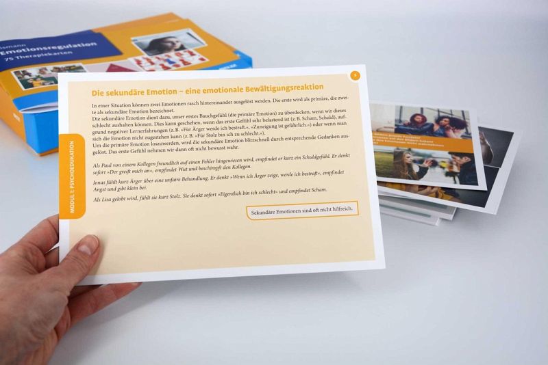 Emotionsregulatorische Kompetenzen können gezielt gefördert werden. Dies zu erreichen und die Arbeit mit Emotionen für bedürfnisorientierte Veränderungsprozesse nutzbar zu machen, sind die Ziele dieses Kartensets.Gegliedert in sieben Module, können die Karten themenbezogen eingesetzt werden. Sie führen vom Verständnis und der Akzeptanz für Emotionen hin zu Strategien aktiver Emotionsregulation. Eine punktuelle Auswahl einzelner Karten sowie deren flexible modulübergreifende Vernetzung sind möglich. So kann die Therapie individuell und bedürfnisgerecht angepasst werden. Der emotionsfokussierte Charakter der Therapiekarten intensiviert die psychotherapeutische Arbeit.Innovative Techniken und Übungen, emotional ansprechende Bilder und Anleitungen zur Selbstreflexion bieten einen erlebnisorientierten Zugang zur Thematik. Die Karten eignen sich für den Einsatz in Psychotherapie, Supervision, Selbsterfahrung und psychologischer Beratung, im Einzel- oder Gruppensetting.Aus dem Inhalt:Psychoedukation - Emotionskarten - Emotionen und Bedürfnisse analysieren und verstehen - Emotionsbezogene Stressregulation - Achtsamkeit, Akzeptanz und Selbstmitgefühl - Emotionsregulation durch Veränderung von Gedanken - Emotionsregulation durch Verhaltensänderung
