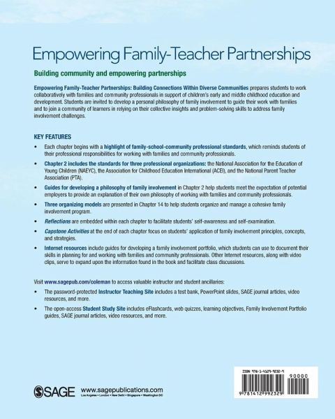 Empowering Family-Teacher Partnerships: Building Connections Within Diverse Communities by Thomas M. Coleman prepares students to work collaboratively with families and community professionals in support of children's early education and development. The author takes a student-centered approach to delivering substantive information and framing activities. Students are invited to develop a personal philosophy of family involvement to guide their work with families and to join a community of learners in relying upon their collective insights and problem-solving skills to address family involvement challenges.