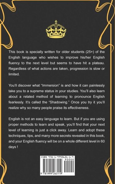 The Secret to Speak Fluent English As An Adult This book is specially written for older students (25+) of the English language who wishes to improve his/her English fluency to the next level but seems to have hit a plateau. Regardless of what actions are taken, progression is slow or limited. Here is a checklist to see if this guide is for you. This Book is For You If.. ¿ You can understand 70% of an English speaking movie. ¿ You can answer simple questions in a conversation, but you have a hard time elaborate your points when trying to explain in more details. ¿ You can have a short conversation, but you stutter sometimes when you speak. ¿ You are 20 years old and above. ¿ You stutter when you try to speak fast. ¿ You can speak quite well, but you have a strong accent. If one of those sounds familiar to you, perhaps you have found the right book. This book is essential for you to break through and not only improving your spoken skills but developing them so well regardless of your age. Armed with the proven tips, tricks, and techniques in this book, you'll discover that you'll be soaring to an entirely new and exciting level of learning within days. On top of that, these guidelines can be used nearly effortlessly. Proven Technique That Works You'll discover what "Immersion" is and how it can painlessly take you to a supreme status in your studies. You'll also learn about a related method of learning to pronounce English fearlessly. It's called the "Shadowing." Once you try it you'll realize why so many people praise its effectiveness. English is not an easy language to learn. But if you are using proper methods to learn and speak, you'll find that your next level of learning is just a click away. Learn and adopt these techniques, tips, and many more secrets revealed in this book, and your English fluency will be on a whole different level in 60 days ! Remember: Practice doesn't make perfect. Perfect practice makes perfect.