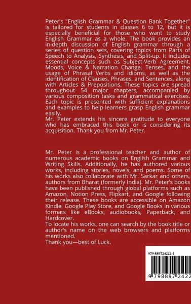 Peter's "English Grammar & Question Bank Together" is tailored for students in classes 6 to 12, but it is especially beneficial for those who want to study English Grammar as a whole. The book provides an in-depth discussion of English grammar through a series of question sets, covering topics from Parts of Speech to Analysis, Synthesis, and Split-up. It includes essential concepts such as Subject-Verb Agreement, Moods, Voice & Narration Change, Tenses, and the usage of Phrasal Verbs and idioms, as well as the identification of Clauses, Phrases, and Sentences, along with Articles & Prepositions. These topics are spread throughout 54 major chapters, accompanied by various composition tasks and grammatical exercises. Each topic is presented with sufficient explanations and examples to help learners grasp English grammar easily. Mr. Peter extends his sincere gratitude to everyone who has embraced this book or is considering its acquisition. Thank you from Mr. Peter.
