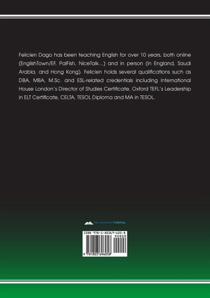 Felicien Dago has been teaching English for over 10 years, both online (EnglishTown/EF, PalFish, NiceTalk...) and in person (in England, Saudi Arabia, and Hong Kong). Felicien holds several qualifications such as DBA, MBA, M.Sc. and ESL-related credentials including International House London's Director of Studies Certificate, Oxford TEFL's Leadership in ELT Certificate, CELTA, TESOL Diploma and MA in TESOL.