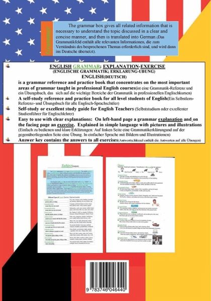 English Grammar (Englisch Grammatik) is an excellent learn book for the student to better his English and his English grammar. It is arranged for an Intermediate Student to advance up to an Upper intermediate level. The book is designed in such a manner that the grammatic subject is first explained in a professional manner with a German translation, and then a professional exercise is presented to test the students profecency. The answer key is provided in the back of the book. This English Grammar (Englisch Grammatik) book is presented in a clear concise manner, and is a learning tool for a English Teacher as well as the student. (Die englische Grammatik (Englisch Grammatik) ist ein hervorragendes Lernbuch für den Schüler, um sein Englisch und seine englische Grammatik zu verbessern. Es wird arrangiert, dass ein Intermediate Student auf eine obere Mittelstufe aufsteigt. Das Buch ist so gestaltet, dass das Grammatikfach zunächst mit einer deutschen Übersetzung professionell erklärt wird und anschließend eine professionelle Übung präsentiert wird, um die Leistungsfähigkeit der Schüler zu testen. Der Antwortschlüssel befindet sich auf der Rückseite des Buches. Dieses englische Grammatikbuch (Englisch Grammatik) ist klar und prägnant und ist ein Lernwerkzeug für einen Englischlehrer und den Schüler.)
