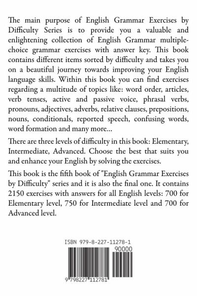 The main purpose of English Grammar Exercises by Difficulty Series is to provide you a valuable and enlightening collection of English Grammar multiple-choice grammar exercises with answer key. This book contains different items sorted by difficulty and takes you on a beautiful journey towards improving your English language skills. Within this book you can find exercises regarding a multitude of topics like: word order, articles, verb tenses, active and passive voice, phrasal verbs, pronouns, adjectives, adverbs, relative clauses, prepositions, nouns, conditionals, reported speech, confusing words, word formation and many more... There are three levels of difficulty in this book: Elementary, Intermediate, Advanced. Choose the best that suits you and enhance your English by solving the exercises. This book is the fifth book of "English Grammar Exercises by Difficulty" series and it is also the final one. It contains 2150 exercises with answers for all English levels: 700 for Elementary level, 750 for Intermediate level and 700 for Advanced level.