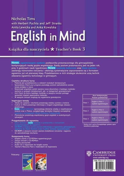 English in Mind Polish Exam edition is a 3-level course for teenagers. The Teacher's Book consists of detailed information for teachers about the English in Mind Polish Exam edition's 16 core units - and additional parts referring to exam sections - found in the Student's Book. Additionaly, the Teacher's Book is accompanied with 16 unit progress tests (for two groups: A and B) evaluating all four language skills: vocabulary, grammar, reading and writing.