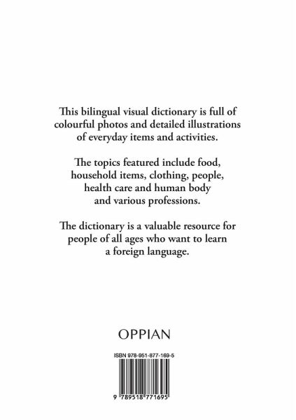 This bilingual visual dictionary is full of colourful photos and detailed illustrations of everyday items and activities. The topics featured include food, household items, clothing, people, health care and human body and various professions. The dictionary is a valuable resource for people of all ages who seek to learn a foreign language.