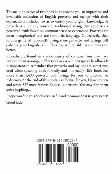 The main objective of this book is to provide you an impressive and invaluable collection of English proverbs and sayings with their explanations included, so as to enrich your English knowledge. A proverb is a simple, concrete, traditional saying that expresses a perceived truth based on common sense or experience. Proverbs are often metaphorical and use formulaic language. Collectively, they form a genre of folklore.Knowing these proverbs and sayings will enhance your English skills. Thus you will be able to communicate better. Proverbs are found in a wide variety of contexts. You may have noticed them in songs, in film titles or even in newspaper headlines.It is important to remember that proverbs and sayings are sometimes used when speaking both formally and informally. This book has more than 1,400 proverbs and sayings for you to discover or rediscover.At the end of this book, as a bonus for you, I have chosen and wrote 327 most famous English quotations. You may find them quite inspiring… I hope you find this book very useful and recommend it to your peers! Good luck!