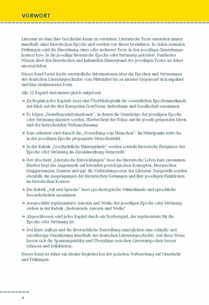 - Kompakt und einheitliche strukturierte Kapitel fassen die wesentlichen Aspekte und Inhalte jeder Epoche oder Strömung präzise zusammen.