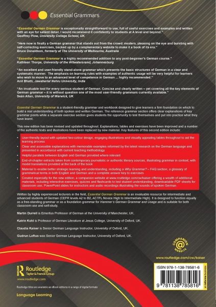 "Students of German with English language backgrounds will welcome the second edition of the Essential German Grammar. It is an excellent, user friendly stand-alone Grammar which presents the basic structures of German in a clear and systematic manner. Grammatical concepts are explained in a glossary which teachers too will find useful. The emphasis on learning rules with examples of authentic usage will be very helpful for Learners who wish to move to an advanced level of competence in German. This well designed volume is highly recommended." Anil Bhatti, Jawaharlal Nehru University, India