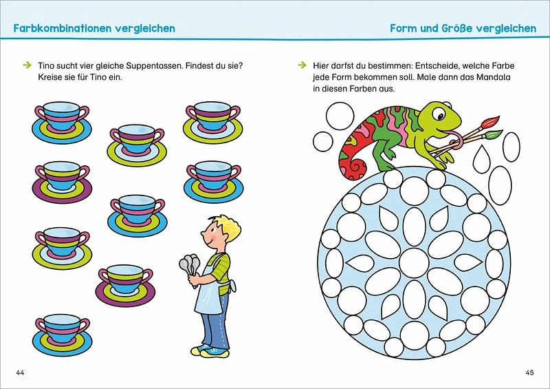 Mit fröhlichen Illustrationen und bunten Rätseln üben Vorschulkinder spielerisch die Farben und Formen. Die Aufgaben fördern die visuelle Wahrnehmung, das räumliche Denken und die Konzentration. Welche Gegenstände sind rund und welche sind eckig? Wie muss das Muster weitergehen? Welche Farben sind hell und welche dunkel? Mit diesen und vielen weiteren Übungen können die Kinder geometrische Formen erkennen, Formen und Farbkombinationen vergleichen und Reihenfolgen fortführen. Das macht jede Menge Spaß und ganz nebenbei werden die Kinder auf die Anforderungen der Schule vorbereitet.