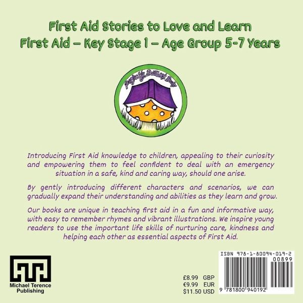 First Aid - Key Stage 1 - Age Group 5-7 Years Introducing First Aid knowledge to children, appealing to their curiosity and empowering them to feel confident to deal with an emergency situation in a safe, kind and caring way, should one arise. By gently introducing different characters and scenarios, we can gradually expand their understanding and abilities as they learn and grow. Our books are unique in teaching first aid in a fun and informative way, with easy to remember rhymes and vibrant illustrations. We inspire young readers to use the important life skills of nurturing care, kindness and helping each other as essential aspects of First Aid.