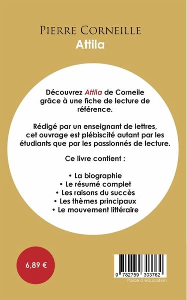 Décryptez Attila avec l'analyse de Paideia éducation ! Que faut-il retenir de cette pièce de théâtre de Corneille ? Retrouvez tout ce que vous devez savoir de ce chef-d'¿uvre de la littérature française dans une analyse de référence pour comprendre rapidement le sens de l'¿uvre. Rédigée de manière claire et accessible par un enseignant, cette fiche de lecture propose notamment un résumé, une étude des thèmes principaux, des clés de lecture et des pistes de réflexion. Une analyse littéraire complète et détaillée pour mieux lire et comprendre le livre ! Paideia éducation en deux mots : Plébiscité aussi bien par les passionnés de littérature que par les lycéens, Paideia éducation est considéré comme une référence en matière d'analyses d'¿uvres littéraires. Celles-ci ont été conçues pour guider les lecteurs à travers la littérature. Nos auteurs appartiennent aux milieux universitaire et de l'éducation, gage de sérieux pour vous faire découvrir les plus grandes ¿uvres de la littérature mondiale.