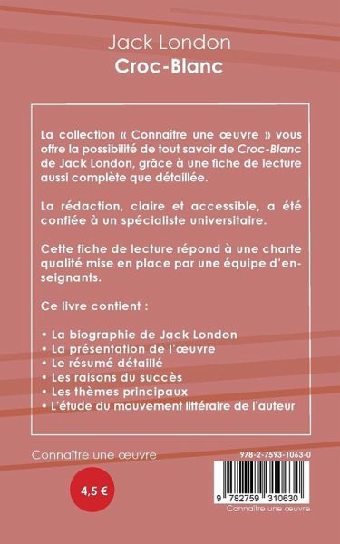 La collection ' Connaître une uvre ' vous offre la possibilité de tout savoir de Croc-Blanc de Jack London, grâce à une fiche de lecture aussi complète que détaillée. La rédaction, claire et accessible, permet une meilleure compréhension de l'uvre analysée. Cette fiche de lecture répond à une charte qualité mise en place par une équipe d'enseignants. Ce livre contient la biographie de Jack London, la présentation du roman, le résumé détaillé (chapitre par chapitre), les raisons du succès, les thèmes principaux et l'étude du mouvement littéraire.