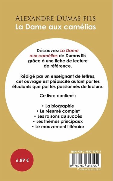 Décryptez La Dame aux camélias avec l'analyse de Paideia éducation ! Que faut-il retenir du roman d'Alexandre Dumas fils ? Retrouvez tout ce que vous devez savoir de ce chef-d'¿uvre de la littérature française dans une analyse de référence pour comprendre rapidement le sens de l'¿uvre. Rédigée de manière claire et accessible par un enseignant, cette fiche de lecture propose notamment un résumé, une étude des thèmes principaux, des clés de lecture et des pistes de réflexion. Une analyse littéraire complète et détaillée pour mieux lire et comprendre le livre ! Paideia éducation en deux mots : Plébiscité aussi bien par les passionnés de littérature que par les lycéens, Paideia éducation est considéré comme une référence en matière d'analyses d'¿uvres littéraires. Celles-ci ont été conçues pour guider les lecteurs à travers la littérature. Nos auteurs appartiennent aux milieux universitaire et de l'éducation, gage de sérieux pour vous faire découvrir les plus grandes ¿uvres de la littérature mondiale.