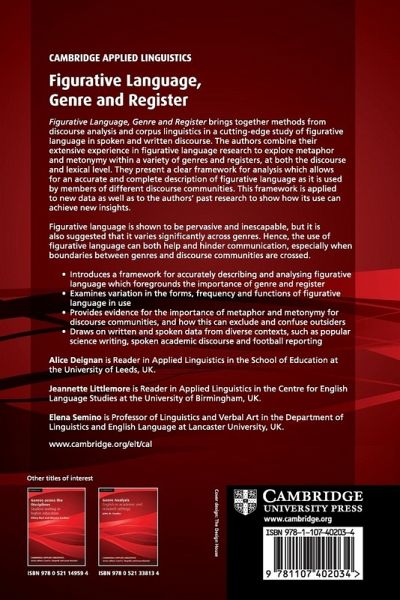 This book brings together methods from discourse analysis and corpus linguistics in a cutting-edge study of figurative language in spoken and written discourse. Figurative Language, Genre and Register brings together discourse analysis and corpus linguistics in a cutting-edge study of figurative language in spoken and written discourse. The authors explore a diverse range of communities from chronic pain sufferers to nursery staff to present a detailed framework for the analysis of figurative language. The reader is shown how figurative language is used between members of these communities to construct their own 'world view', and how this can change with a shift in perspective. Figurative language is shown to be pervasive and inescapable, but it is also suggested that it varies significantly across genres.