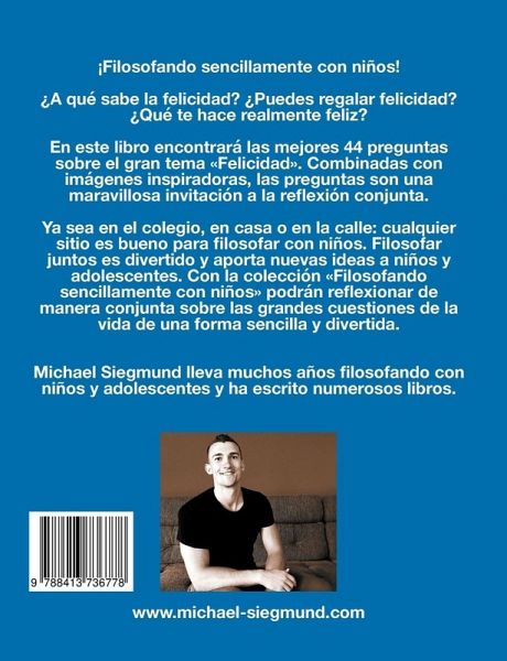 ¡Filosofando sencillamente con niños! ¿A qué sabe la felicidad? ¿Puedes regalar felicidad? ¿Qué te hace realmente feliz? En este libro encontrará las mejores 44 preguntas sobre el gran tema «Felicidad». Combinadas con imágenes inspiradoras, las preguntas son una maravillosa invitación a la reflexión conjunta. Ya sea en el colegio, en casa o en la calle: cualquier sitio es bueno para filosofar con niños. Filosofar juntos es divertido y aporta nuevas ideas a niños y adolescentes. Con la colección «Filosofando sencillamente con niños» podrán reflexionar de manera conjunta sobre las grandes cuestiones de la vida de una forma sencilla y divertida.