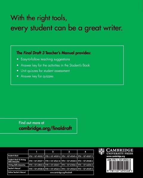 Academic writing is difficult, and Final Draft gives students all the tools they need and prepares students to become confident and effective writers and succeed in their future studies. It gives students the tools to master academic writing by learning a systematic approach that focuses on foundational and higher-level skills. Students are introduced to the rhetorical modes, academic vocabulary, and structures they need to develop their own academic voice. They also learn and edit by the most common grammar mistakes drawn from a unique collection of over 50 million examples of nonnative speakers' writing, promoting accuracy in writing. Every Student's Book includes access to Writing Skills Interactive, an online course with instruction and practice across a range of discrete writing skills and an eBook.